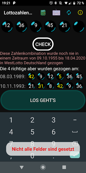 The application generates 6 out of 49 lottery numbers and checks whether the combination has occurred ever in WestLotto Germany